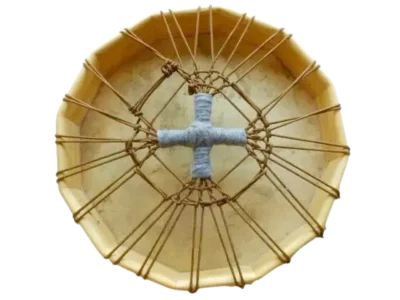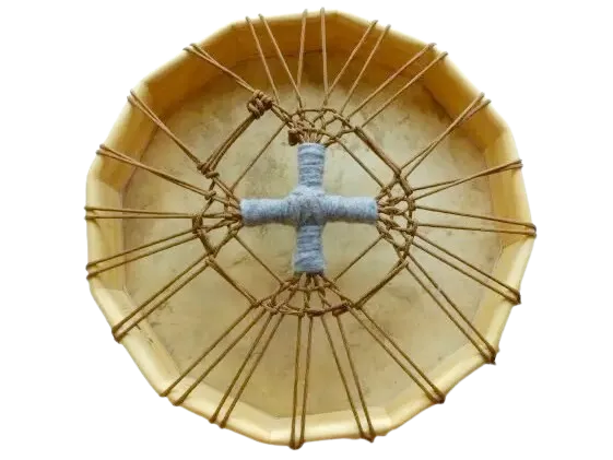 Tambour chamanique en peau de cerf et cadre en bois de peuplier – ovale – dessin croix – 38 cm – réf 1184CEPE