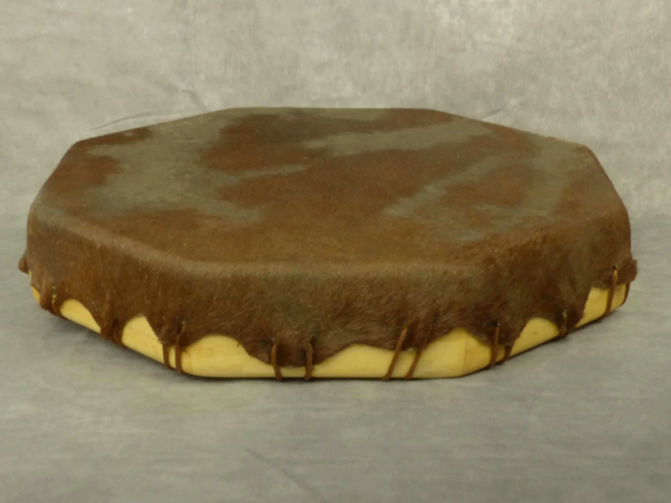 Tambour chamanique octogonal fabriqué à la main à partir de matériaux locaux, sans aucun traitement chimique, en peau de cheval et bois de peuplier.